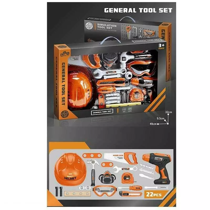 Набір інструментів 778-33 (18/2) 22 елементи, дриль, гайковий ключ, ніж, викрутка, молоток, рулетка, пила, каска, в коробці