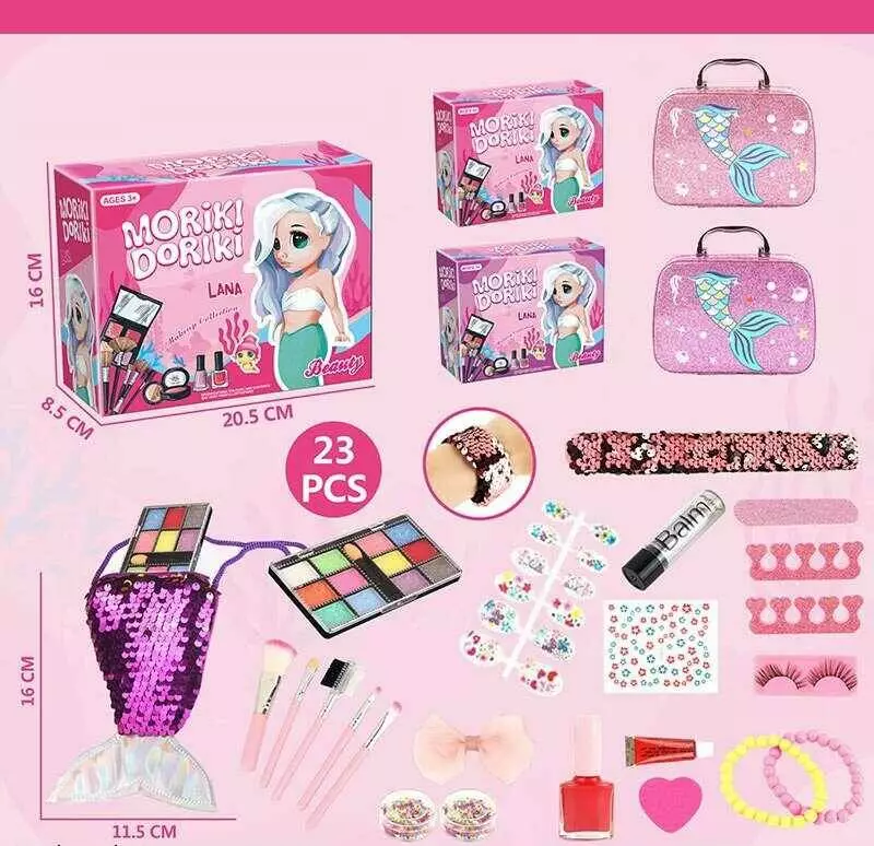 Набір косметики 40012 (60/2) 2 види, тіні, помада, лак для нігтів, накладні вії, накладні нігті, 3 браслети, заколка, сумочка, валіза, в коробці