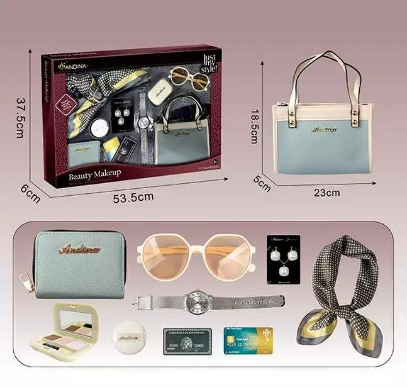 Набір аксесуарів 676-1 (24) сумочка, гаманець, імітація косметики, функціональний годинник, імітація карток, хустка, окуляри, прикраси, в коробці