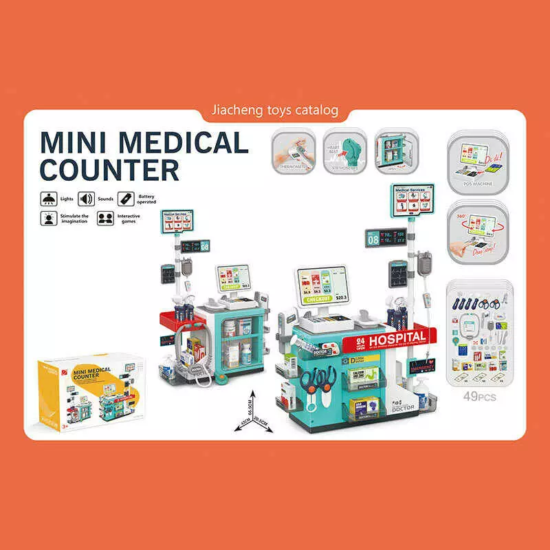 Набір лікаря 660-95 (18) 49 ел., стетоскоп, термометр, каса, звук, світло, на батарейках, інструменти для огляду, муляжі грошей, полички, в коробці