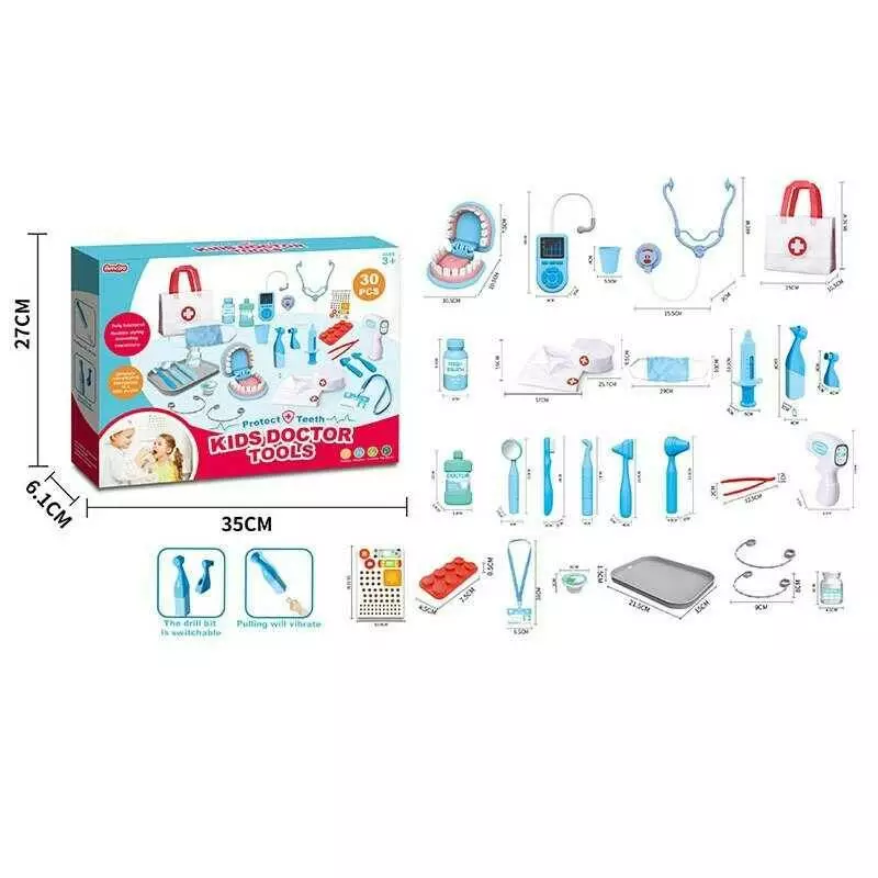 Набір лікаря A 83-3 (36/2) 30 елементів, бормашина з вібрацією, 2 щелепи, брекети, термометр, стетоскоп, пінцет, медична сумочка, в коробці