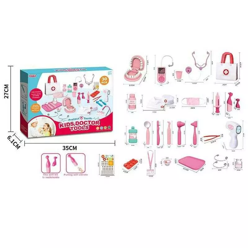 Набір лікаря A 83-4 (36/2) 30 елементів, бормашина з вібрацією, 2 щелепи, брекети, термометр, стетоскоп, пінцет, медична сумочка, в коробці
