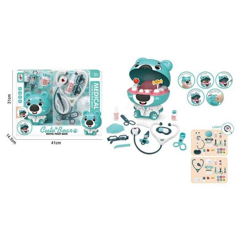 Набір лікаря SD 169-356 A (15) “Стоматолог”, висота ведмедика - 16 см, скарбничка, стетоскоп, підсвічування, шприц, ножиці, лоток, окуляри, в коробці