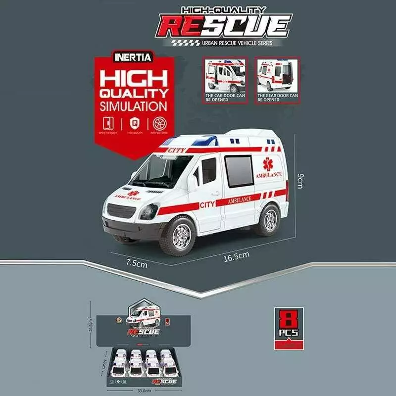 Набір машин 711-38 A (16/2) ЦІНА ЗА 8 ШТУК В БЛОЦІ, “Швидка Допомога”, розмір - 16.5х7.5х9 см, інерція, відкриваються двері, в коробці