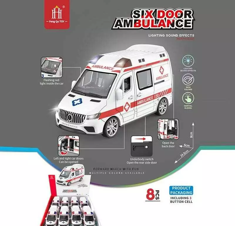 Набір машин 731-37 D (12) ЦІНА ЗА 8 ШТУК В БЛОЦІ, “Швидка допомога”, розмір - 14.5х6х8 см, інерція, звуки, підсвічування, відкр. двері, в коробці