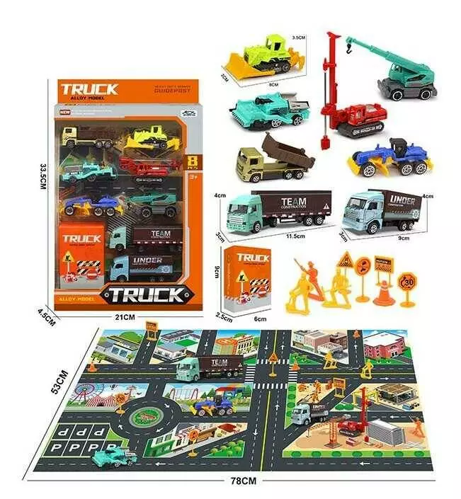 Набір машин KX 09-8 (72/2) металопластик, 8 шт., будівельна техніка, декорації, карта з вулицями, у коробці