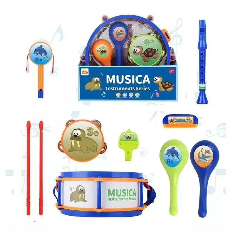 Набір музичних інструментів 717 A (24) барабан: 28х28х12 см, барабанні палички, маракаси, бубон, колотушка, свисток, сопілочка, ремінець, в коробці