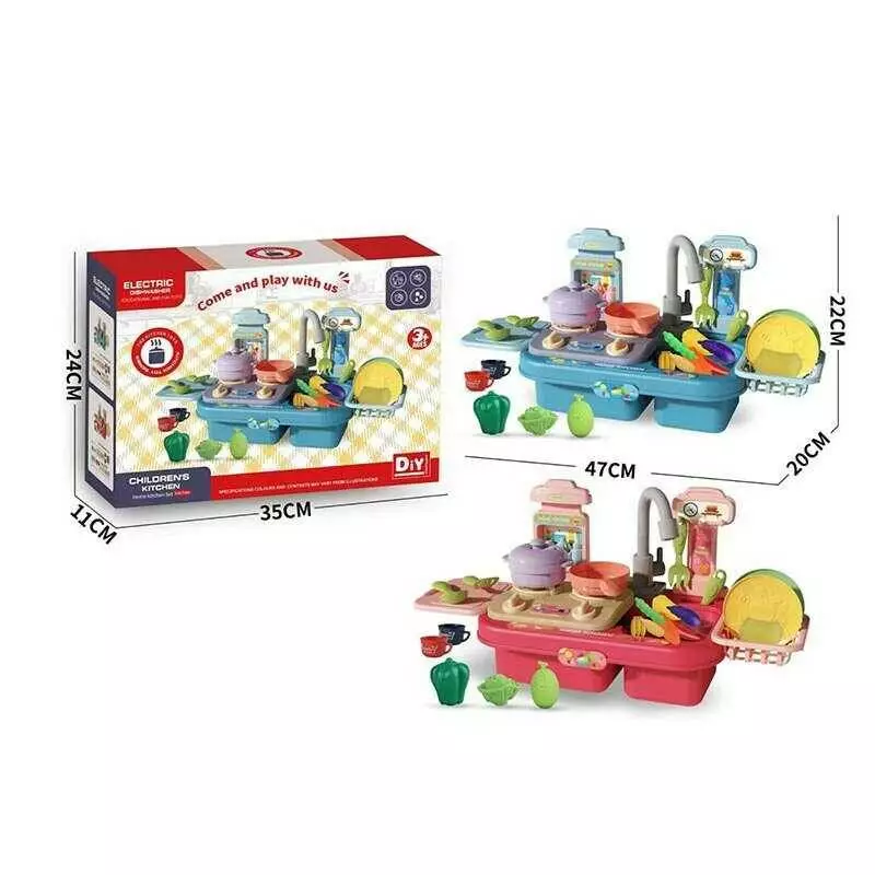 Набір посуду 33029 B (36/2) 2 кольори, кран на батарейках, плита, набір овочів та фруктів, посуд, коробці