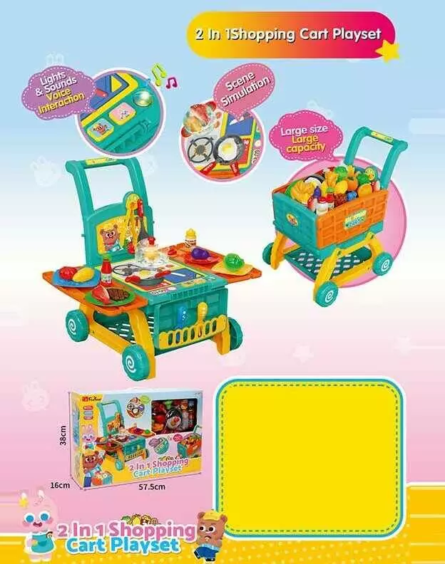 Набір посуду 35633 A (6/2) 39 деталей, 2 в 1: візок та портативна кухня, імітація плити, світло, звук, мелодії, англ. фрази, аксесуари, в коробці