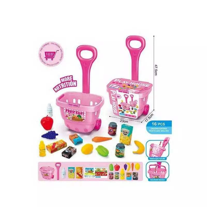 Набір продуктів 8239 (40/2) 16 елементів, 2в1: кошик/візочок, телескопічна ручка, висота 48см, фрукти, баночки з напоями, коробочки зі смаколиками