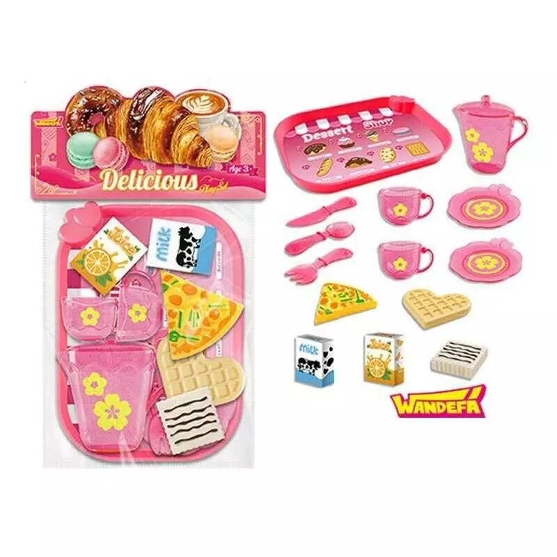 Набір продуктів 99008 (120/2) таця, 2 чашки, 2 блюдця, чайничок, ніж, ложка, вилка, шматок піци, вафля, коробочки з молоком і соком, в пакеті