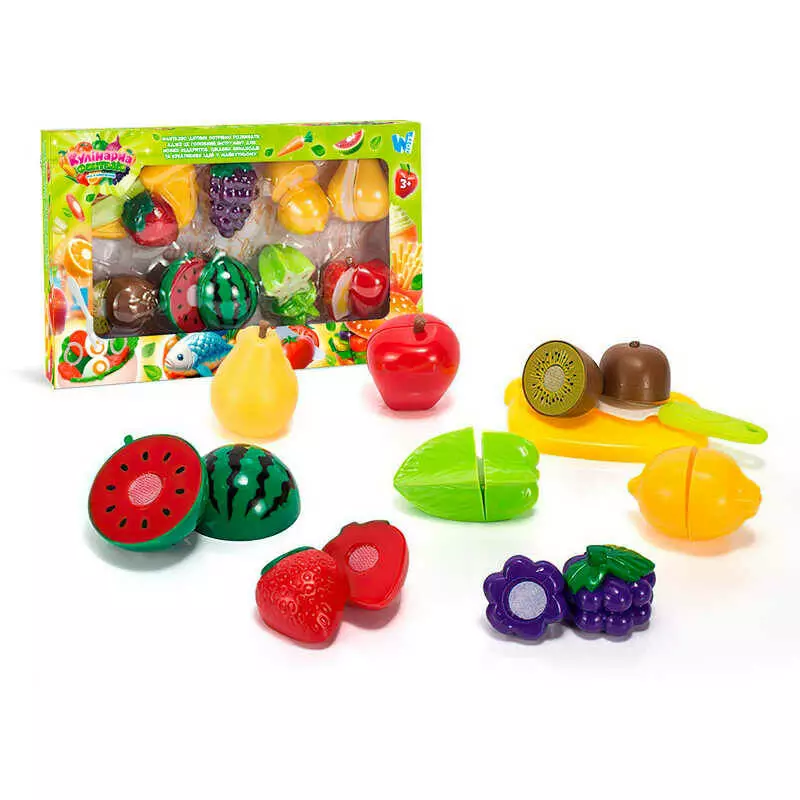 Набір продуктів “Кулінарна фантазія” 77650 (64/2) "WToys", 18 елементів, фрукти на липучках, дошка для нарізання, ніж, в коробці