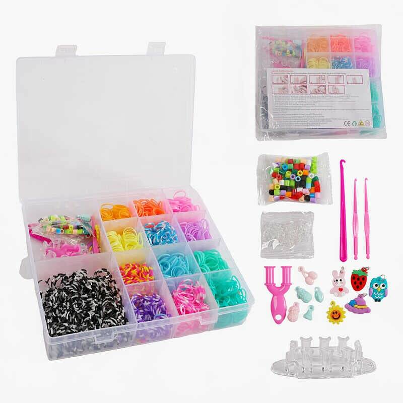 Набір резиночок для плетіння D 122 (72) 13 кольорів, верстат, пластикова фурнітура, рогатка, гачки, намистинки, підвіски, інструкція, в боксі