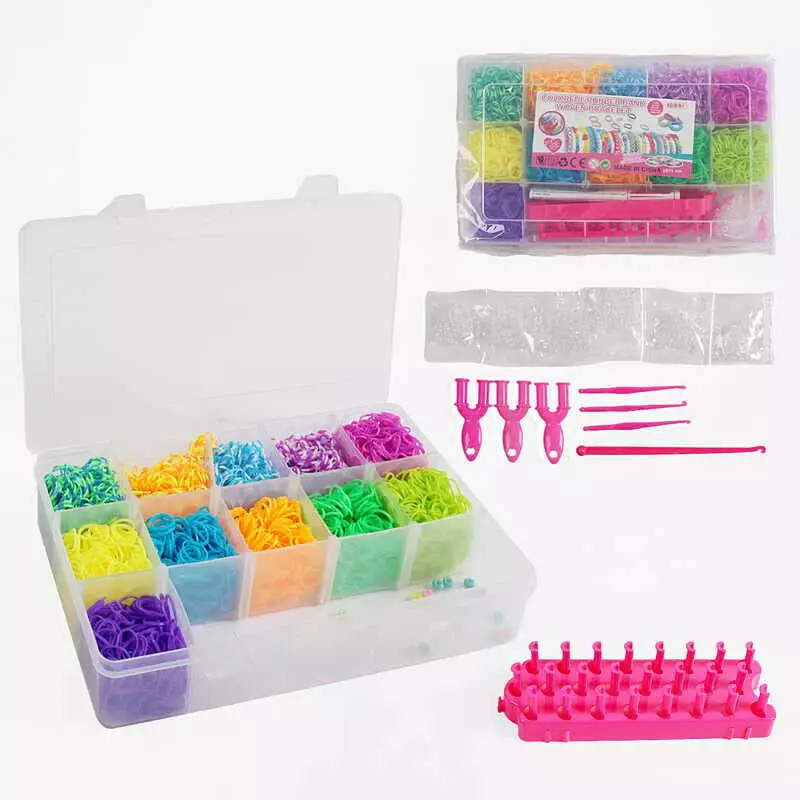 Набір резиночок для плетіння J 786 (48/2) 11 кольорів, пластикова фурнітура, рогатки, гачки, верстат, намистинки, інструкція, в боксі