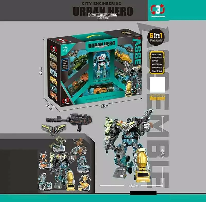 Набір трансформерів 908-10 B (12) 6в1, робот висотою 48см, бластер, екскаватор, 2 бульдозери, самоскид, кран, бетонозмішувач, в коробці