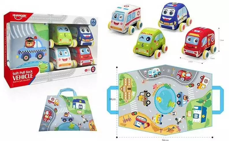 Набор тканевых машин HE 0219 (48/2) 4 шт в коробке, инерция, сумка-коврик