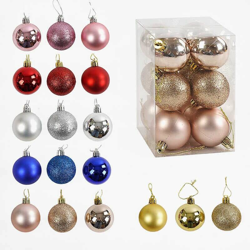 Новорічні прикраси C 67657 (96) 6 видів, кульки, 12 штук, D=5 см, у слюді, ВИДАЄТЬСЯ МІКС ВИДІВ