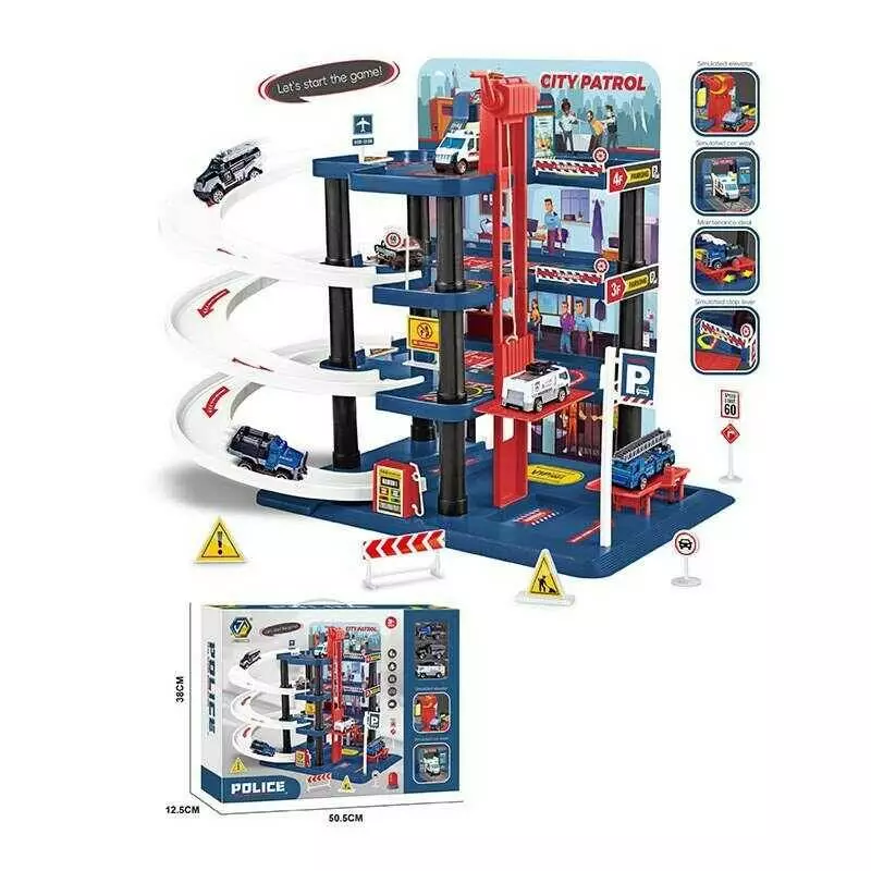 Трек 652 J43 (10/2) трирівневий, масштаб - 1:64, механічний ліфт, спіральні траси, 3 металопластик. машинки, аксесуари, наліпки, в коробці