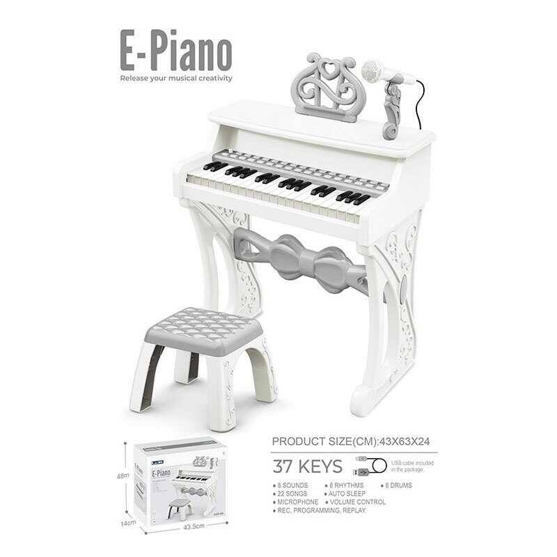 Піаніно 328-60 (6) мікрофон, стілець, 37 клавіш, від мережі або батарейок, звук, мелодії, 2 регулювання гучності, функція запису, в коробці