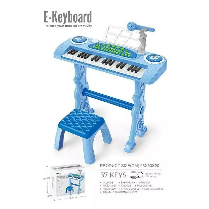 Синтезатор 328-65 (8) мікрофон, стілець, 37 клавіш, від мережі або батарейок, звук, мелодії, регулювання гучності, функція запису, в коробці