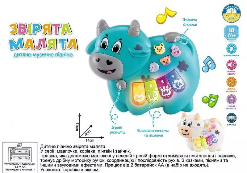 Піаніно 85270 (120/2) "WToys", "КОРІВКА", 2 кольори, УКРАЇНСЬКЕ ОЗВУЧУВАННЯ, ноти, мелодії, пісні, казки, світло, цифри, звуки тварин, в коробці
