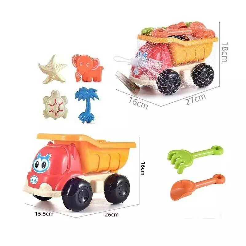 Пісочний набір C 468 (48/2) розмір самоскида - 26х15.5х16 см, лопатка, граблі, 4 формочки, в сітці