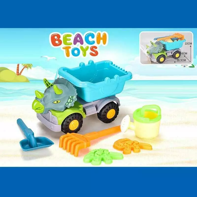 Пісочний набір JX 6858 (36/2) розмір самоскида -35.5х16х22 см, лопатка, граблі, лійка, 2 формочки, у сітці