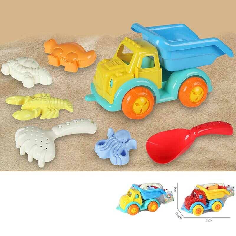 Пісочний набір KZ 6436 (24/2) 2 кольори, розмір самоскида - 35х18.5х9 см, лопатка, граблі, 4 формочки, в сітці