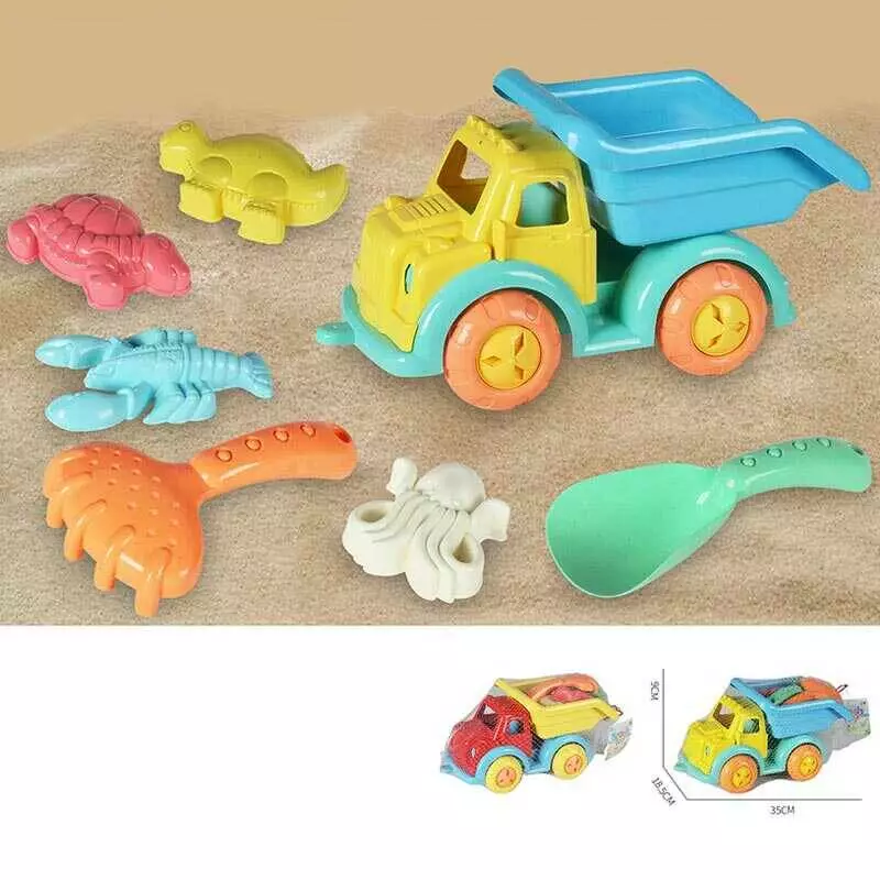Пісочний набір KZ 6436 A (24/2) 2 кольори, розмір самоскида - 35х18.5х9 см, лопатка, граблі-сито, 4 формочки, в сітці