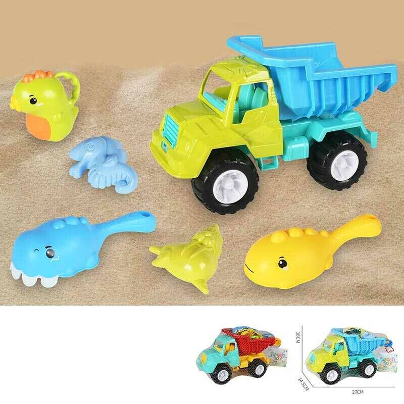 Пісочний набір KZ 6437 (36/2) 2 кольори, розмір самоскида - 27х14.5х18 см, лопатка, граблі, лійка, 2 формочки, в сітці