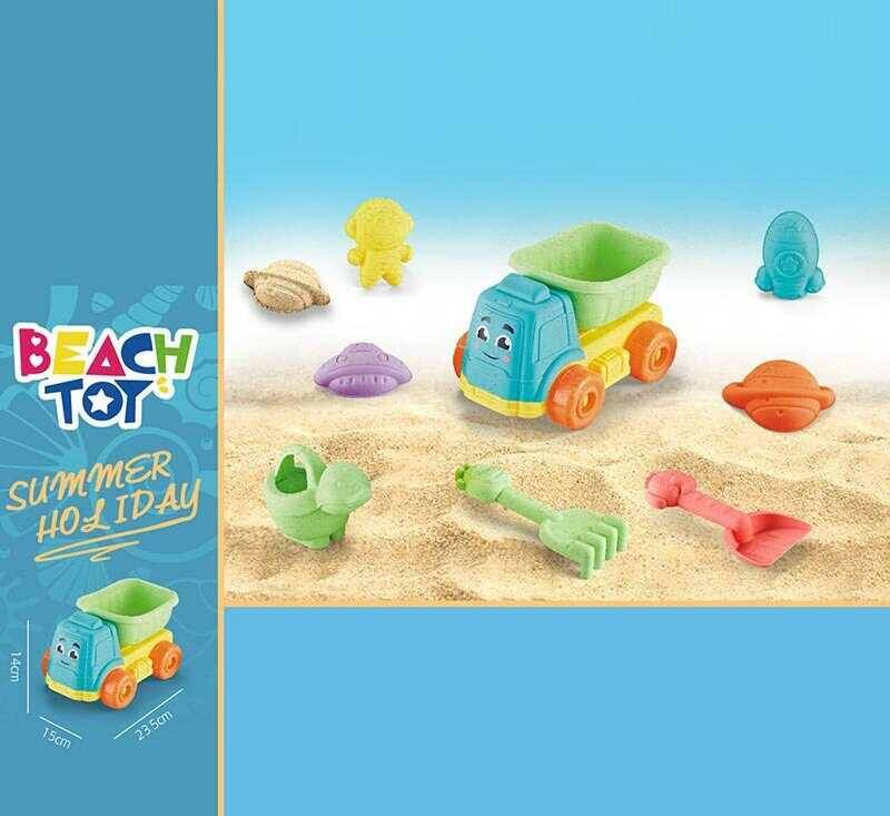 Пісочний набір RMT 366-5 (72) розмір самоскида - 21х15х12.5, лійка, граблі, лопатка, 4 формочки, в сітці