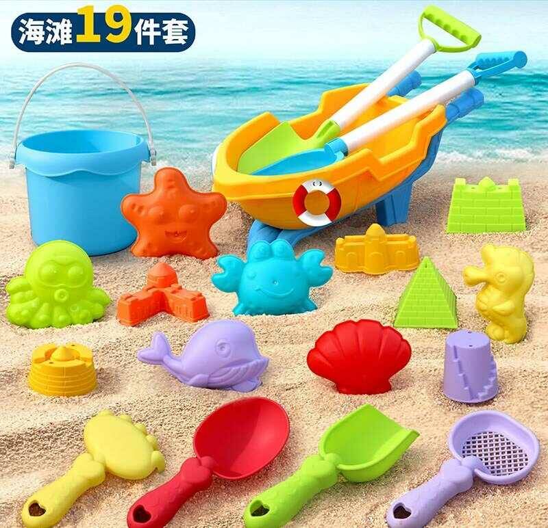 Пісочний набір W 218-45 (30/2) розмір тачки - 27х13х11 см, висота відра - 9 см, граблі, сито, 4 лопатки, 11 формочок, в сітці