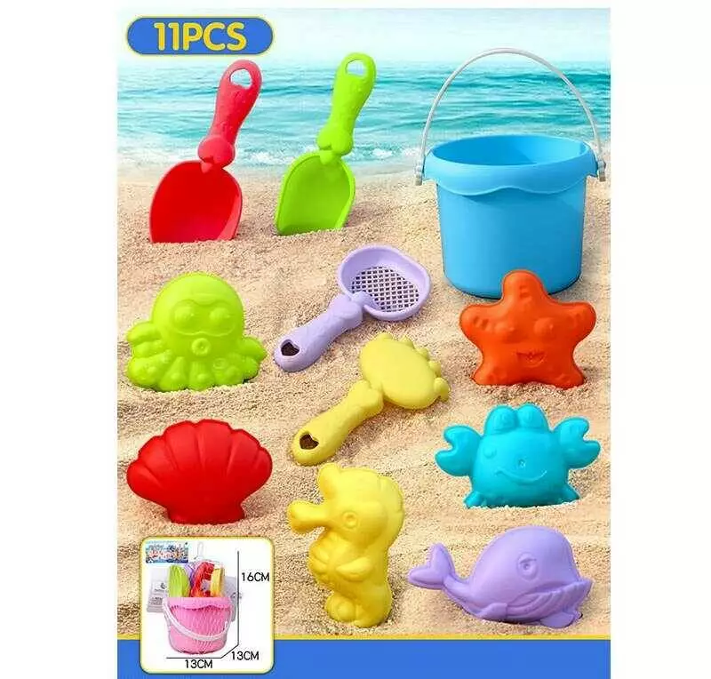 Пісочний набір W 218-73 (144/2) 2 кольори, висота відра - 9.5 см, граблі, сито, 2 лопатки, 6 формочок, в сітці