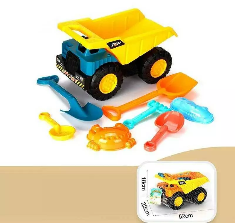 Пісочний набір YF 3643 (20) 8 елементів, 2 лопатки, 2 форми, самоскид, граблі, сито, в сітці