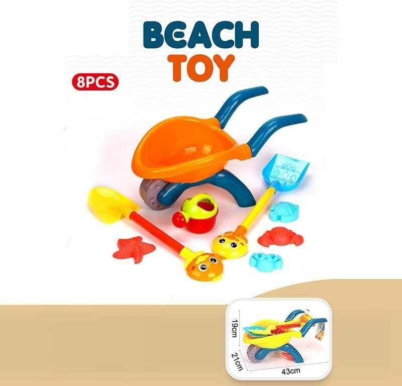 Пісочний набір YF 3696 (24) 8 елементів, тачка, лопатка, граблі, лійка, форми для піску, в сітці