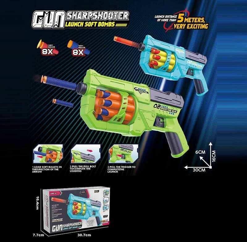 Пістолет 803-4 (48) 2 кольори, розмір - 30х6х16 см, 16 м’яких патронів, механічний принцип, обертовий барабан, в коробці