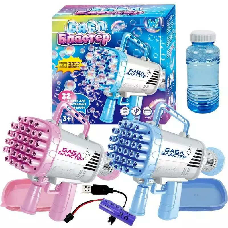 Пістолет з мильними бульбашками 49076 (60) "WToys", 2 види, акум. 3,7 V, підсвічування, 32 отвори, мильний розчин, в коробці