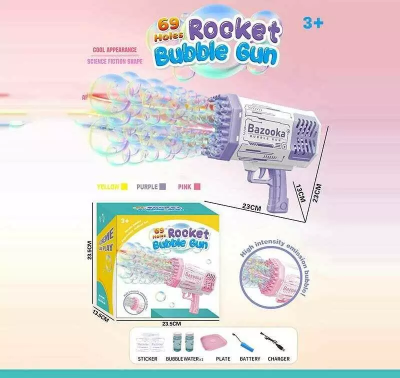 Пістолет з мильними бульбашками 57737 (24) "WToys", 3 кольори, 69 отворів, світло, автоматичний, 2 пляшечки з мильним розчином, акум. 3.7V, в коробці