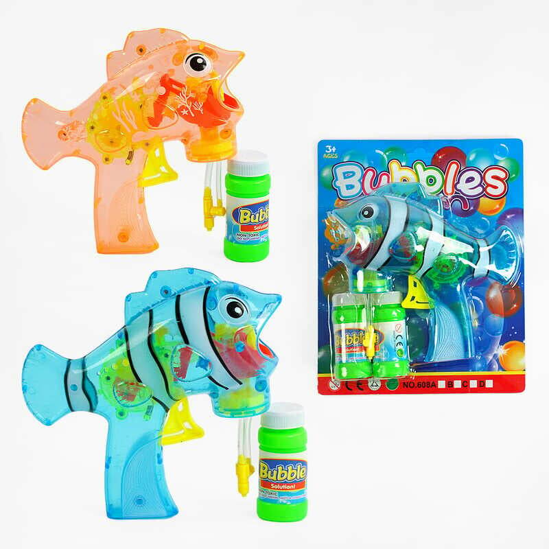 Пістолет з мильними бульбашками 608 B (60/2) 2 види, “Рибка”, механічний принцип роботи, 2 пляшки з мильним розчином, на листі