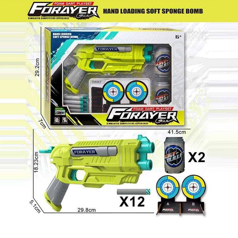 Пістолет з мішенню JM 002 B (36) 30х5х18 см, механічний принцип роботи, 4 картонні мішені, 2 банки, 12 м’яких патронів, в коробці
