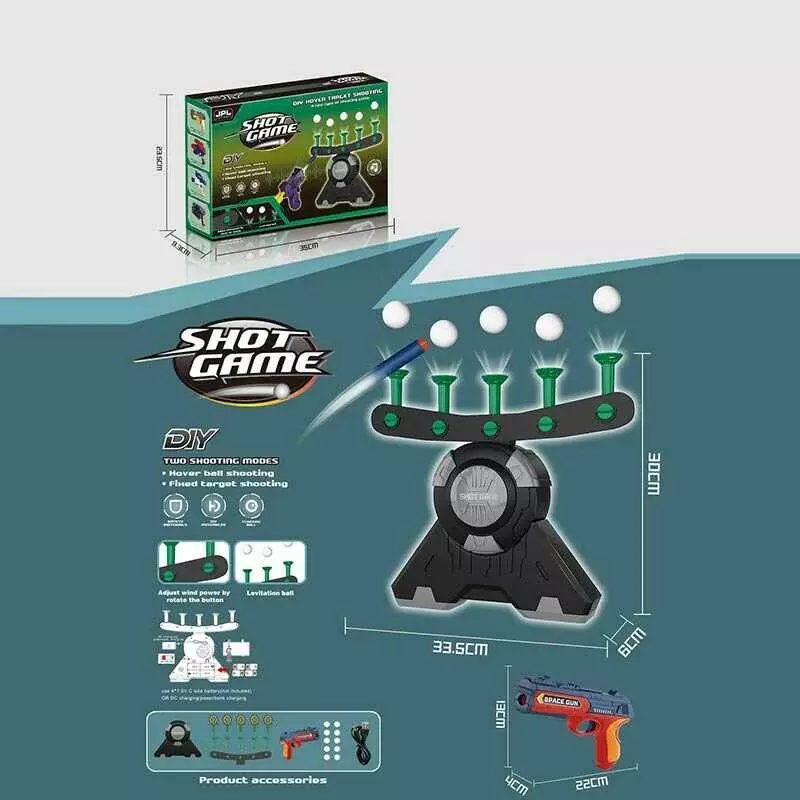Повітряний тир 19891 A (24) 6 м`яких патронів, 10 кульок, 5 мішеней, механічний пістолет, працює від батарейок та мережі, в коробці