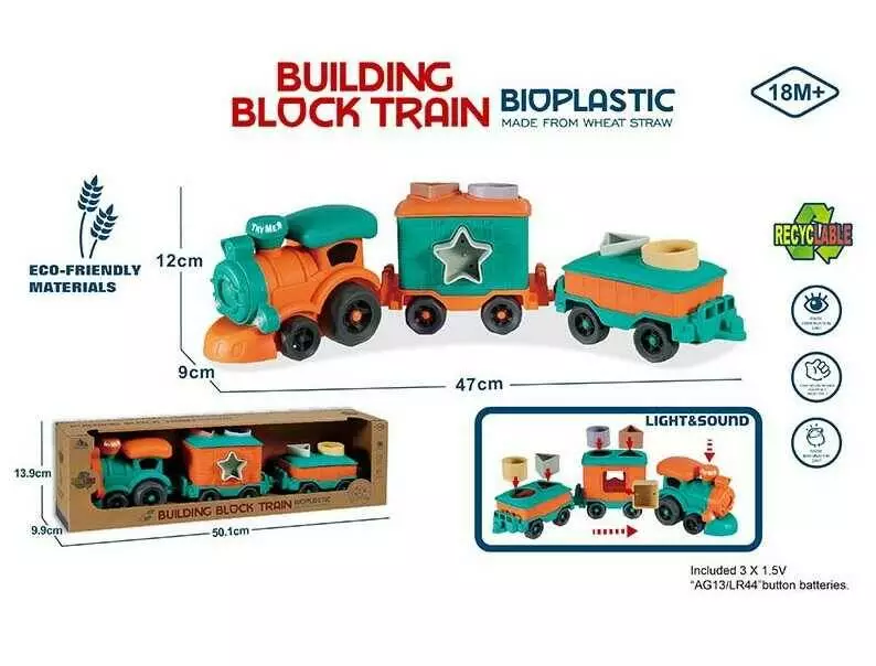 Потяг 933-831 AM (40/2) локомотив, 2 вагони, звуки, підсвічування, геометричний сортер, біопластик, в коробці