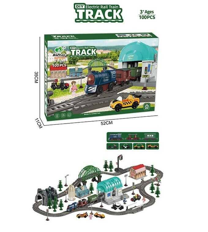 Залізниця AU 8665 (18) 108 елементів, підсвічування, звуки транспорту, автоматичний рух потяга, станція, магнітне з`єднання, світлофор, в коробці