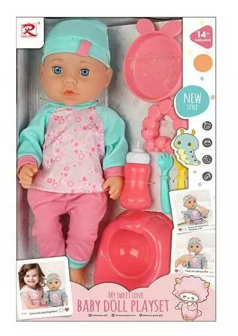 Пупс 6333 (24) висота - 35 см, закриваються очі, ходить на горщик, знімний одяг, пляшечка, виделка, ложка, тарілочка, іграшка, горщик, в коробці