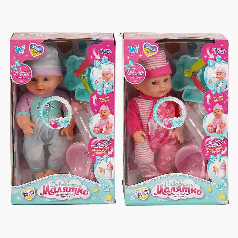 Пупс функціональний UKA-A 0940-1 (32/2) 2 види, "WToys", ОЗВУЧУВАННЯ УКРАЇНСЬКОЮ МОВОЮ, звук, від батарейок, п`є, ходить в туалет, в коробці