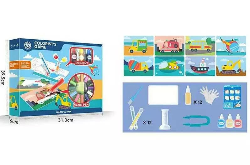 Розмальовка піском HJD 0903-3 (36/2) 12 кольорів піску, 8 двосторонніх розмальовок, фарби, 12 фломастерів, рукавички, в коробці