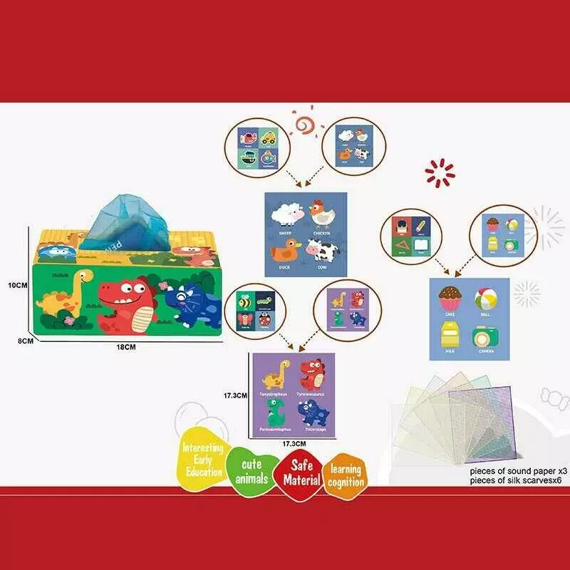Розвивальна гра 368-4 (168) “Серветниця”, текстиль, 6 серветок, тварини, транспорт, комахи, шкільне приладдя, шелестючі елементи, англійські назви, в