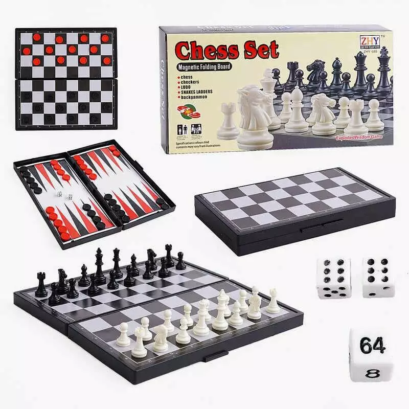 Шахи 689 A18 (96/2) двостороння дошка, нарди, 3 гральні кубики, в коробці