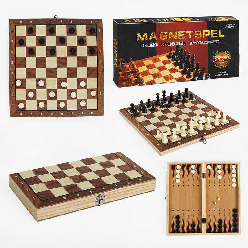 Шахи магнітні C 61553 (48) 3в1, шашки, нарди, дерев’яна дошка 34х34 см, в коробці