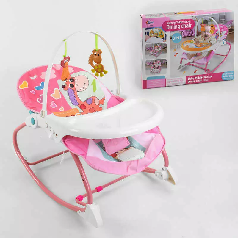 Шезлонг 8169 (6) 2в1 шезлонг і дитячий стільчик, музичний блок з вібрацією, знімна стільниця, 2 підвісних гризунки, в коробці